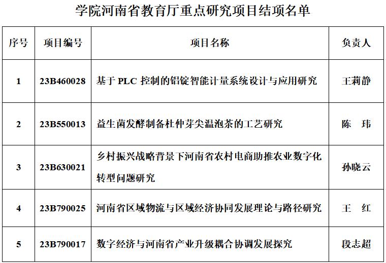 根据《河南省教育厅高等学校重点研究项目管理办法》,学院教师在完成研究任务后及时提交结项材料,经省教育厅审核,认定提交研究资料完整,结项报告系统详实,符合结项要求,准予结项。具体名单公布如下: