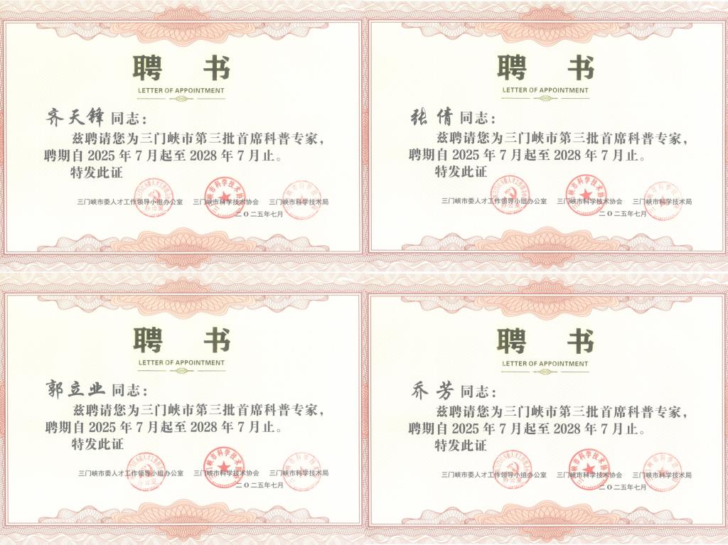 近日,三门峡市第三批首席科普专家评审揭晓,学院4名教师获聘三门峡市第三批首席科普专家。截至目前,学院累计已有9位教师获聘三门峡市首席科普专家。此外,在第四届三门峡市科普讲解大赛暨河南省科普讲解大赛选拔赛中,学院荣获“优秀组织奖”,2名参赛选手获成人组优秀奖。