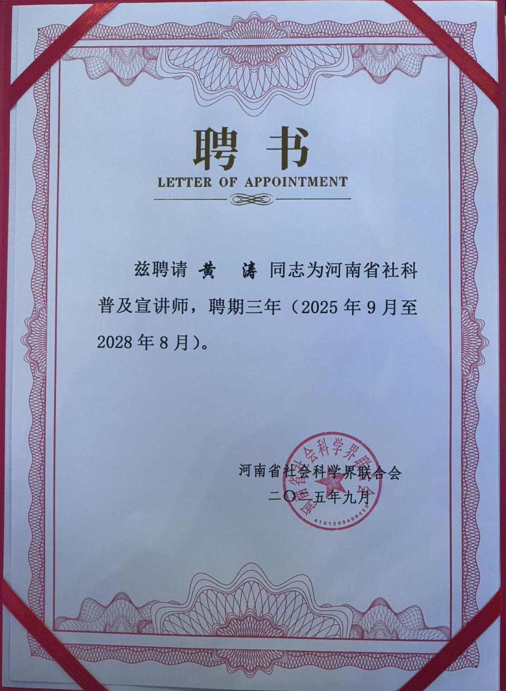 9月18日,由河南省委宣传部、省社科联联合主办的2025年河南省社会科学普及周启动仪式在郑州顺利举行。仪式上,学院黄涛博士被聘请为河南省社科普及宣讲师。这一荣誉不仅是对黄涛博士个人专业能力与社科普及工作热情的高度认可,更是学院在社科普及领域持续深耕的又一重要成果,将为学院进一步拓展社科普及工作范围、提升工作影响力注入新活力。