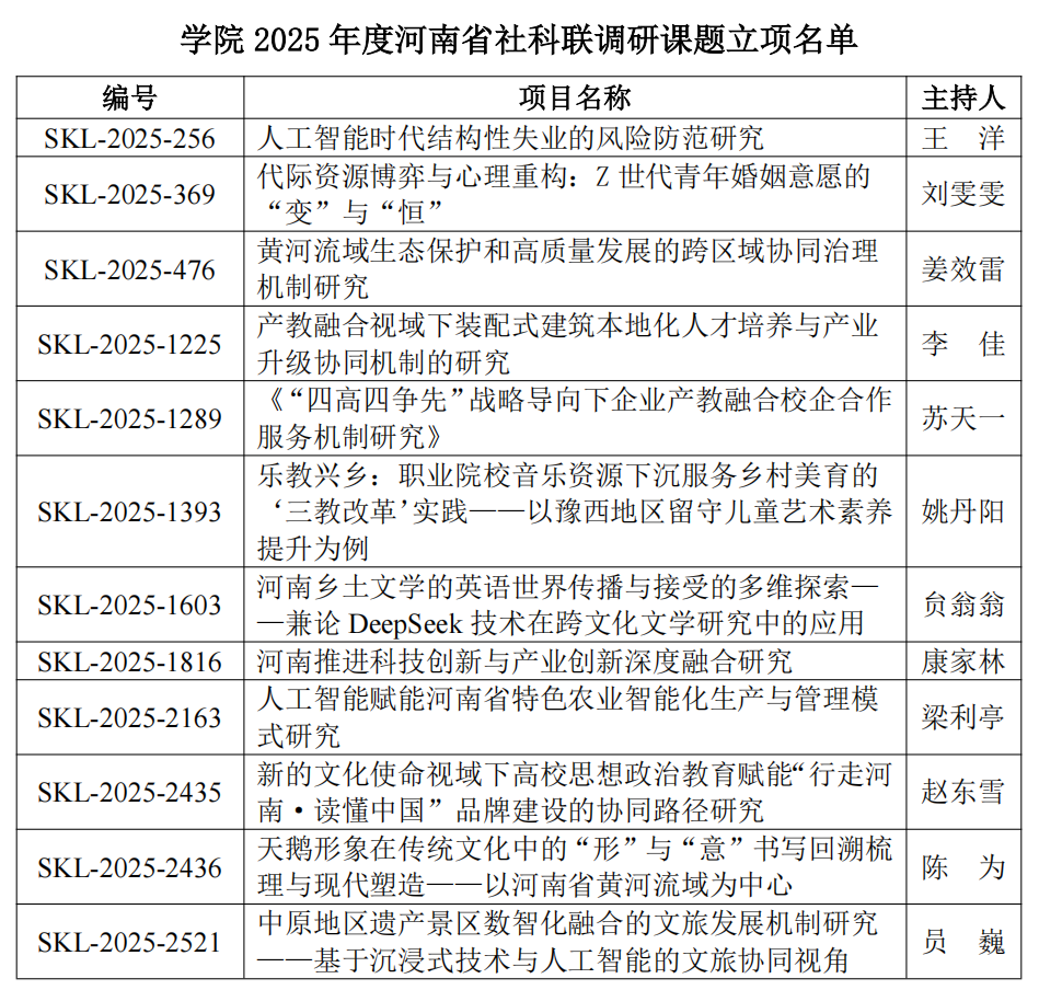 在2025年省社科联调研课题立项方面,学院凭借精准的选题定位与研究积淀,成功立项12项调研课题,比2024年度立项课题增加了4项。该年度立项课题聚焦人工智能应用、黄河流域生态保护、职业教育创新、文旅融合升级等前沿热点方向,为服务河南经济社会高质量发展注入了新的活力。