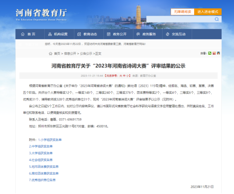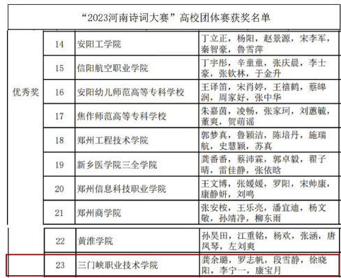 近日,从河南省教育厅获悉,在“2023年河南省诗词大赛”上, 我校由龚余璐、罗志帆、段雪静、徐晓阳、李宁一、康宝月等六名学生组成的团队,经过层层选拔,最终斩获高校团体赛优秀奖。