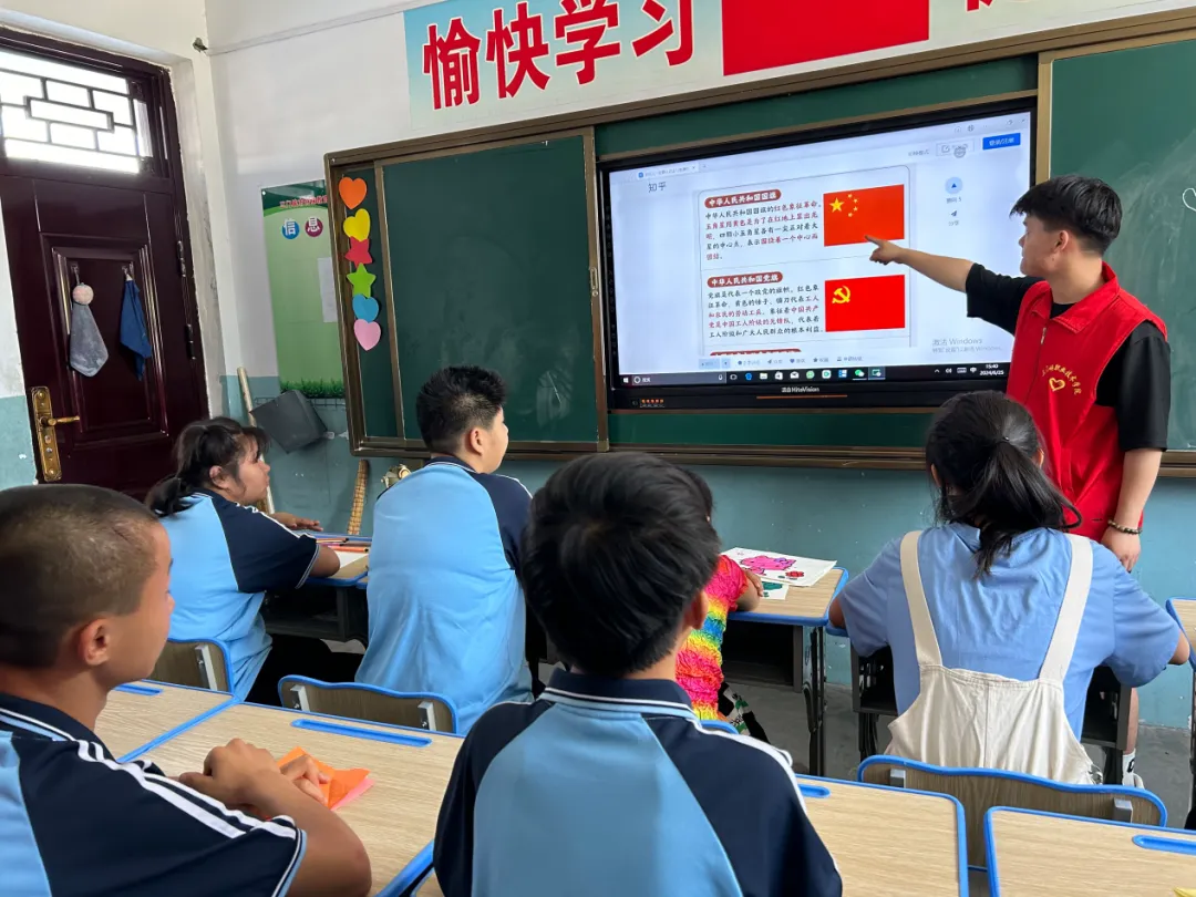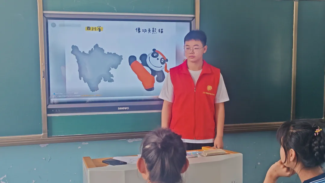 实践团成员还精心设计了“爱国教育”环节,团队成员们教孩子们认识国旗、党旗,唱国歌、红歌,陪他们观看红色动画片,培养他们的爱国主义情感和民族自豪感。团队成员还用通俗易懂的语言耐心地教孩子们认识中国的地图,认识祖国的全貌和各个省份的名称,加深孩子们对地理知识的认识。
