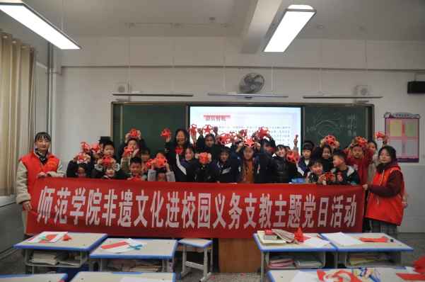 活动接近尾声,支教老师、同学们和小朋友们一起拿着作品合影留念,小朋友们纷纷举起自己的作品,脸上洋溢着自豪与喜悦在镜头下定格了这温暖而美好的瞬间。此次非遗文化进校园义务支教主题党日活动,不仅让孩子们亲身体验了剪纸艺术的魅力,更在他们心中种下了传承非遗文化的种子。未来,师范学院也将继续开展此类活动,让更多的孩子感受传统文化的博大精深,体会到剪纸传承的独特魅力。