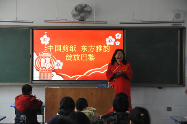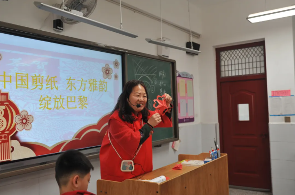 活动伊始,非遗剪纸传承人李竹梅老师走上讲台,为孩子们带来了一场生动的剪纸文化讲座。李老师从剪纸艺术的起源与发展讲起,用通俗易懂的语言和精美的图片,向孩子们展示了剪纸这一传统艺术在不同历史时期、不同地域的独特魅力。孩子们被那些形态各异、寓意深刻的剪纸作品深深吸引,在讲到剪纸工具和基本技巧时,李老师手持剪刀和彩纸,现场示范,如何折叠纸张、如何下刀、如何剪出流畅的线条。