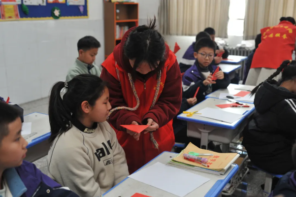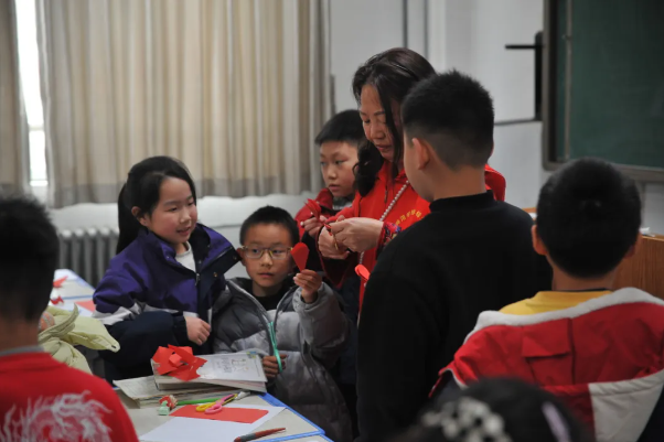 在实践环节,支教老师迟骋和新媒体同学孟志慧走到孩子们中间,手把手地教他们剪纸。小朋友们纷纷拿起剪刀和彩纸尝试起来。一开始,有些小朋友因为紧张,不敢下刀。在大家的帮助下,小朋友们逐渐找到了感觉,沿着画好的线条裁剪。在剪纸过程中,遇到不会的步骤,支教老师迟骋和新媒体同学孟志慧就会反复示范,三剪刀就剪出了同学们的爱国情怀。在大家的共同努力下,一张张彩纸在孩子们的手中逐渐变成了一幅作品《红心向党》这幅富有深意的作品。